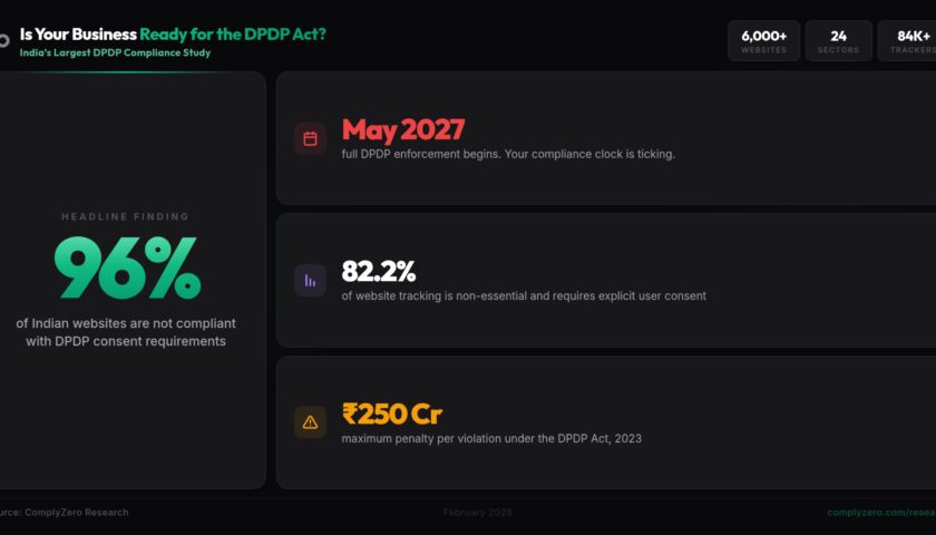 The research was conducted in February 2026 by ComplyZero Research, covering over 6,000 websites across sectors including government, banking, healthcare, education, media, and e-commerce. The report represents the most comprehensive analysis of DPDP cookie consent compliance conducted in India to date.