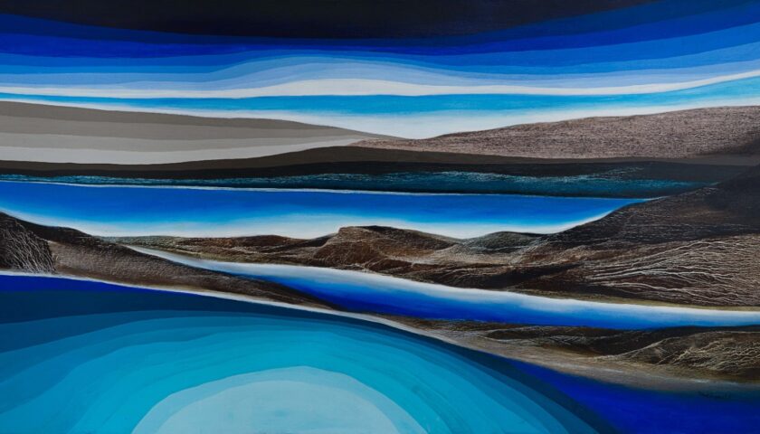 Lot no. 295, Vinod Sharma’s Untitled (2025) is a monumental oil on canvas that presents a serene, abstracted landscape where water, sky, and distant landforms merge into a single, meditative vision. Layers of deep blues, soft greys, and earthy browns flow across the surface, creating a profound sense of depth, calm, and quiet movement, as if the entire scene is mirrored upon a vast, still body of water.