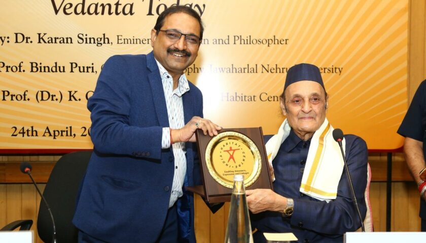 New Delhi, 28 April 2026 — The IHC–ICPR Study Circle held a landmark lecture titled Vedanta Today by Honourable Dr Karan Singh ji at the Gulmohar Hall, India Habitat Centre, New Delhi. The session brought together distinguished scholars and public intellectuals to explore the timeless relevance of Vedantic thought in the contemporary world.