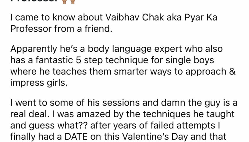 India – The internet is a weird place where random things get viral everyday. Couple of days after Valentine’s day a post from a reddit user is doing rounds on the internet on how a love guru helped him get a date. This created lot of buzz with discussions about Pyaar Ka Professor, a body language expert. His unique techniques are aimed at helping single men develop confidence and social skills, have generated his fandom among singles.